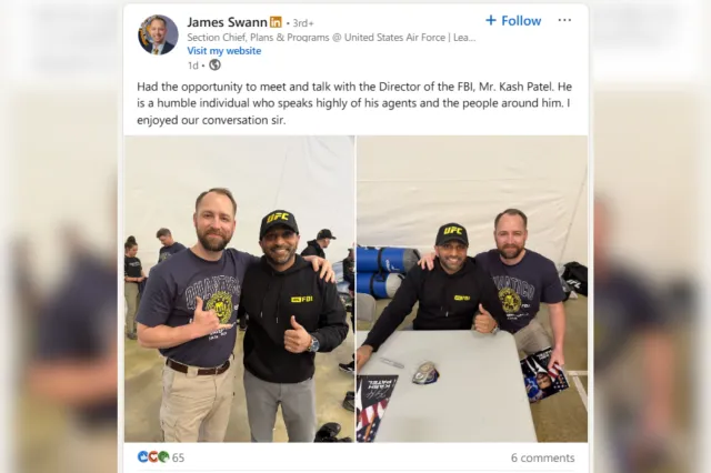 The photos originated from a public LinkedIn where Swann said he had the opportunity to meet Patel at the FBI Academy during the two‑day FBI‑UFC training partnership. In his post, Swann described Patel as “a humble individual” and said he enjoyed their conversation.