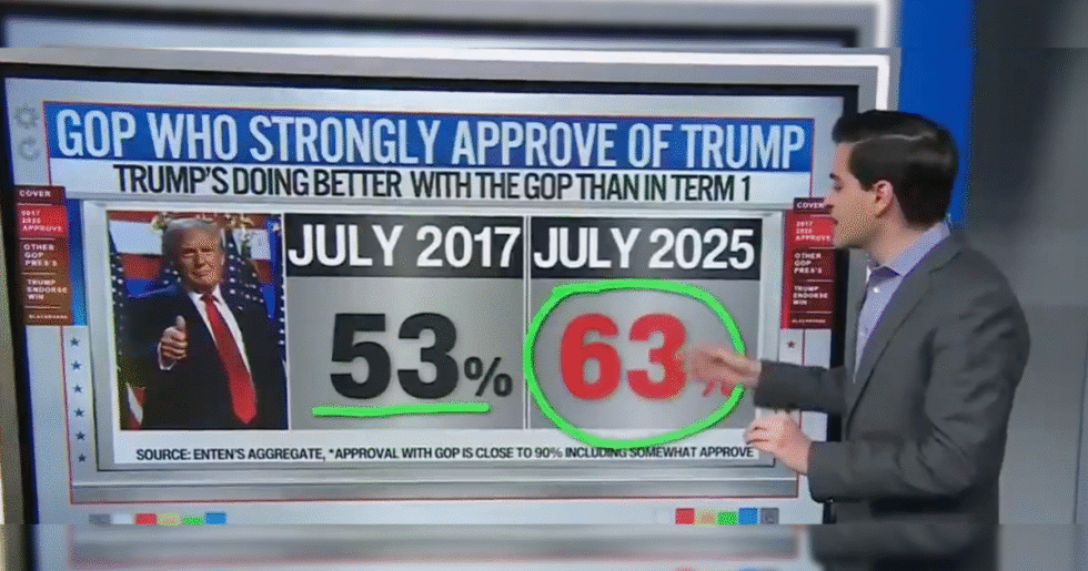GOP voters love for Trump is record breaking. His strong approval (63%) is up like a rocket from term 1 (53%).