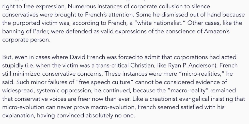 I’ve argued for a long time that David French is willfully obtuse, intellectually lazy, and a profound moral narcissist. His column this weekend appears to have gone farther than all that, trespassing into simple lying. And something else truly remarkable, but let’s save a surprise for the end.French is talking about an old and private conversation, a 2021 group chat on the Clubhouse app, so it’s hard to prove deliberate misrepresentation. But it’s not impossible. It happened in his December 14 column, a description of this years-ago encounter in which he became aware that a group of young right-populist MAGA bros were having a discussion in a group chat under the heading, “David French: Based or cringe.” Finding himself the topic of a discussion, he parachuted in, introducing himself and inviting conversation. And then, miracle of miracles, all the MAGA kids started confessing to him:The conversation was enlightening. While we talked about a number of issues, one theme was dominant — I refused to recognize that America was in a death spiral. The country was in crisis, and I needed to open my eyes, steel my spine and take the necessary, sometimes authoritarian, steps to pull it from the brink.So a group of ideological adversaries is having a chat about how much they don’t like David French, but then David French shows up and they all instantly start sieg-heiling and telling him how much they can’t wait to invade Poland. Oh, Mister French, we’re all just desperate to crush America under the boot of a dictator! What he says they said is that they told him they want to take authoritarian steps to bring America out of a death spiral.Remember this description: They said they want authoritarianism. The first thing you notice — about anything French ever writes, but about this one especially — is his vagueness in painting the picture. Good writers show, bad writers tell, and David French vaguely cartoon pantomimes. There are no names, and only the vaguest characterization of the group and the common identity that brought them into conversation, and there are no direct quotes. That last part is the tell: A bunch of Trump supporters confessed to their authoritarianism, but French can’t bring himself to provide any examples from the thing he tells you was a flood of damning statements. He’s like a homicide detective who won’t tell you the actual content of the murderer’s confession.I’ve sent David French two email messages about this column, asking him (among other things) if the people he was talking to actually used the words “authoritarian” or “authoritarianism,” and asking him to clarify if they explicitly said they sought authoritarian solutions to societal problems or if that’s only his interpretation of their comments. I’ll update this post if he replies, but I’ve sent him messages before without a response. Fortunately, other people who saw or participated in the discussion have written about it, and their characterization of it is significantly different than French’s. And by the way, among the people who have described this 2021 discussion before without mentioning all the naked panting for authoritarianism is a guy named…David French. But we’ll get to that.Start with the easiest example, a piece at Think Outside Politics that (amazingly!) French links to himself. Reminder that this discussion took place in March of 2021, when social media purges were normal and constant. Sample of their description of the conversation French represents as young MAGA dudes declaring their membership in Team Authoritarianism, and read this carefully:The young authoritarians keep pushing French on the question of cancel culture, trying to get him to agree that open discourse is worth defending. He won’t do it. The vicious MAGA right-wingers, yearning to be ruled by a dictator, keep defending free speech, while the bold anti-authoritarian David French keeps rejecting it. Remember how French characterized this discussion: “They told him I needed to open my eyes, steel my spine and take the necessary, sometimes authoritarian, steps to pull it from the brink.” He has a conversation in which a group of opponents keep pushing for freedom of conscience and expression, and then — without providing examples from the discussion — he types up a description in which he was arguing with some authoritarians.This man is a liar.One of the participants in that Clubhouse discussion was Ryan Girdusky, who wrote about it on Substack. I’ve sent him a message asking him to respond specifically to French’s column, and haven’t received a response. But again, you won’t find in Girdusky’s old description a group of young men who longed for authoritarianism, though the discussion in this account is closer to an argument about the use of federal power in a longrunning culture war. Girdusky wrote, back in 2021, that French argued for decentralization, because the right was winning that culture war:This is an astonishing point to have made in 2021, the height of social media purges and corporate cancel culture: “He insisted that the free market and the internet have delivered the ability for more people to speak freely about subjects and have their opinion heard by millions of people.” But again, the argument across the virtual table from French was not that we need authoritarianism; rather, he was arguing with people who wanted to use federal authority against the closing of the culture, reopening conversations that were being throttled, including by government. Reminder:French was arguing for a decentralization of power, yes, but against a setting in which left-captured power was closing the culture and the David French-right thought that no fight was underway. He argued like a visitor from 1990, seeing none of the context of the moment.Argument: The left is using centralized power to dominate the culture and erode freedom, so we need to capture federal aut