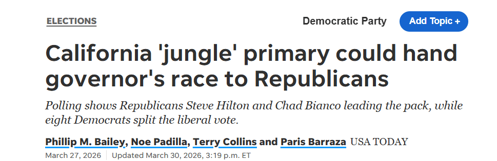 But Swalwell is just one of eight major California Democrats are running in the primary, compared to only two Republicans. And although California is a heavily blue state, Democrats are increasingly worried that they may split the vote so badly that both Republicans will advance, putting the nation’s largest state in Republican hands for the first time since The Terminator ran it.