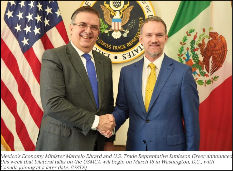 WASHINGTON – Today, U.S Trade Representative Jamieson Greer and Mexican Secretary of Economy Marcelo Ebrard announced the first round of bilateral discussions in preparation for the Joint Review of the United States–Mexico–Canada Agreement (USMCA).