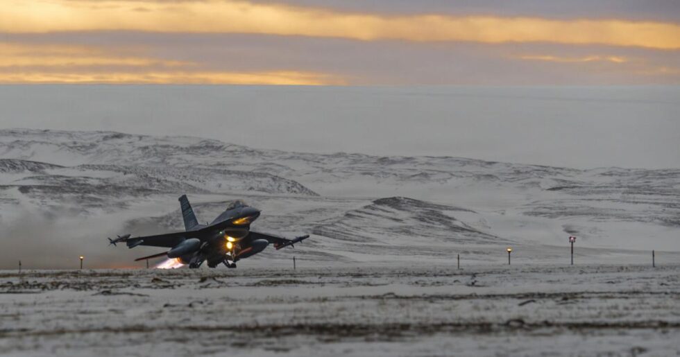 A North American Aerospace Defense Command F-16 Fighting Falcon fighter aircraft from the South Carolina ANG’s 169th FW takes off at Pituffik Space Force Base, Greenland, Oct. 9, 2025. Operating in the Arctic provides the flexibility and adaptability needed to overcome logistical hurdles in a dynamic and unforgiving environment.